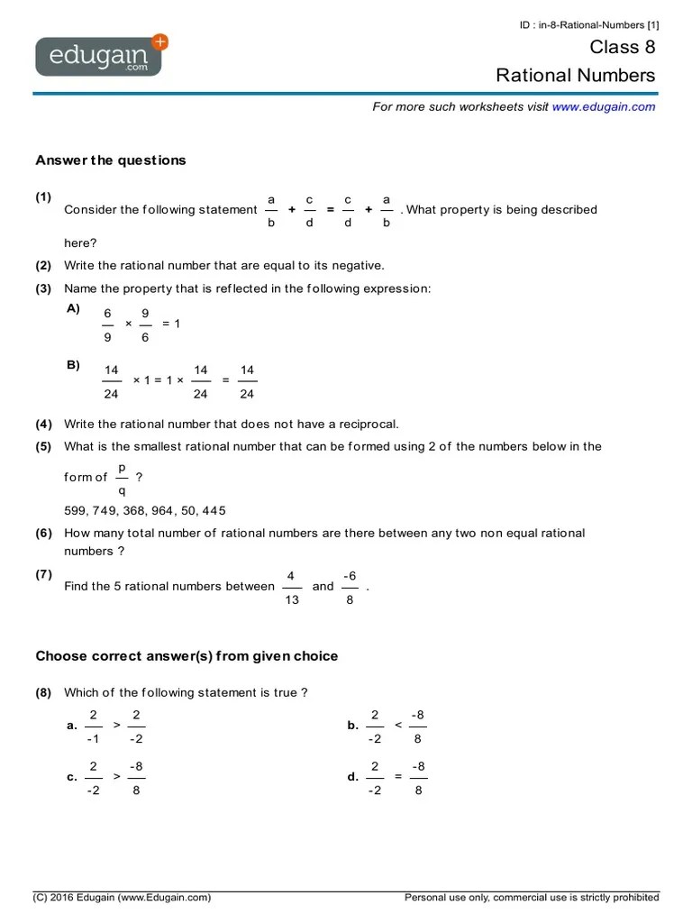 Home › grade8 › grade 8 cbse › maths › rational numbers. Download kvs cbse ncert class 8 rational numbers worksheets in pdf free for all chapters with solutions as per latest 2021 textbooks and syllabus. Rational number worksheets for different grades such as class 7, class 8 and class 9 will help students understand the various operations on rational . Practice the questions given in the worksheet on rational numbers. Get rational numbers, mathematics chapter notes, questions & answers, video lessons, practice test and more for cbse class 10 at topperlearning. Generate unlimited tests and worksheets with dynamic worksheet generator.